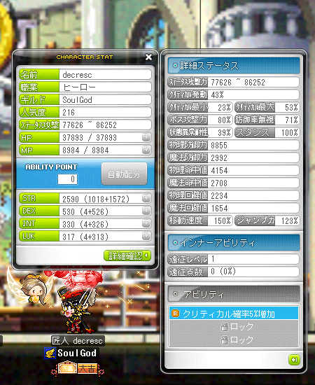 | [Unique]攻撃力+6% LUK+6% 攻撃時モンスターの防御率30%無視 [アイテム特殊能力] ボス攻撃時ダメージ+30% 攻撃時モンスターの防御率10%無視 |